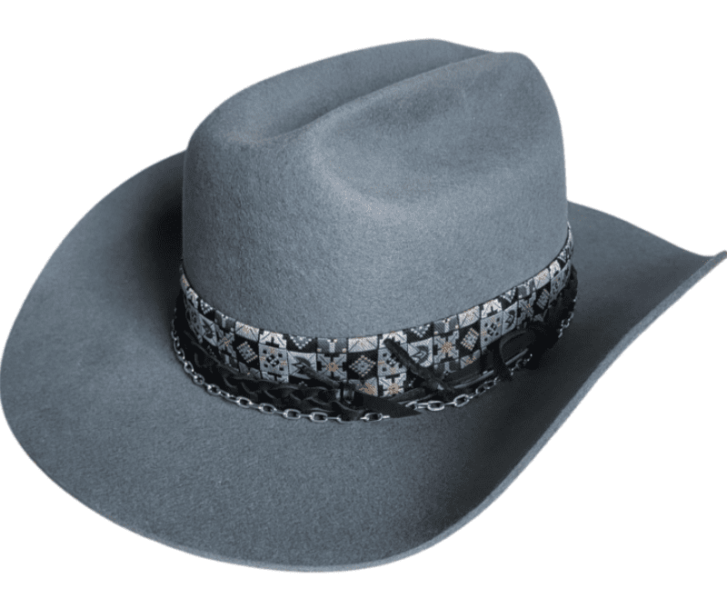 Kapelusz kowbojski w kolorze błękitno – szarym. Ozdobiony plecionym skórzanym paskiem, łańcuszkiem z koralikami, wzorzystą kapeluszową wstążką z kokardą oraz metalową zawieszką w kształcie słońca Na spodzie ronda grawerunek – słońce Podszewka z logo marki Why Hats. Produkt zawiera nietekstylne materiały pochodzenia zwierzęcego. 100% handmade.