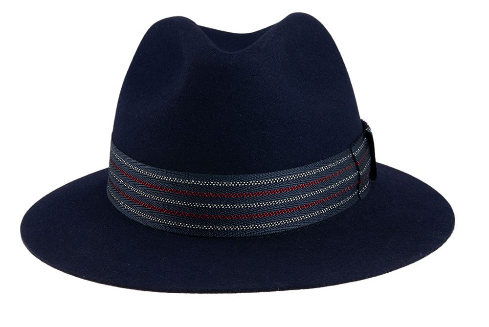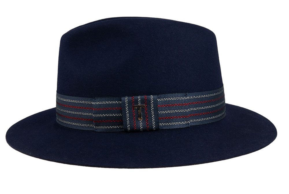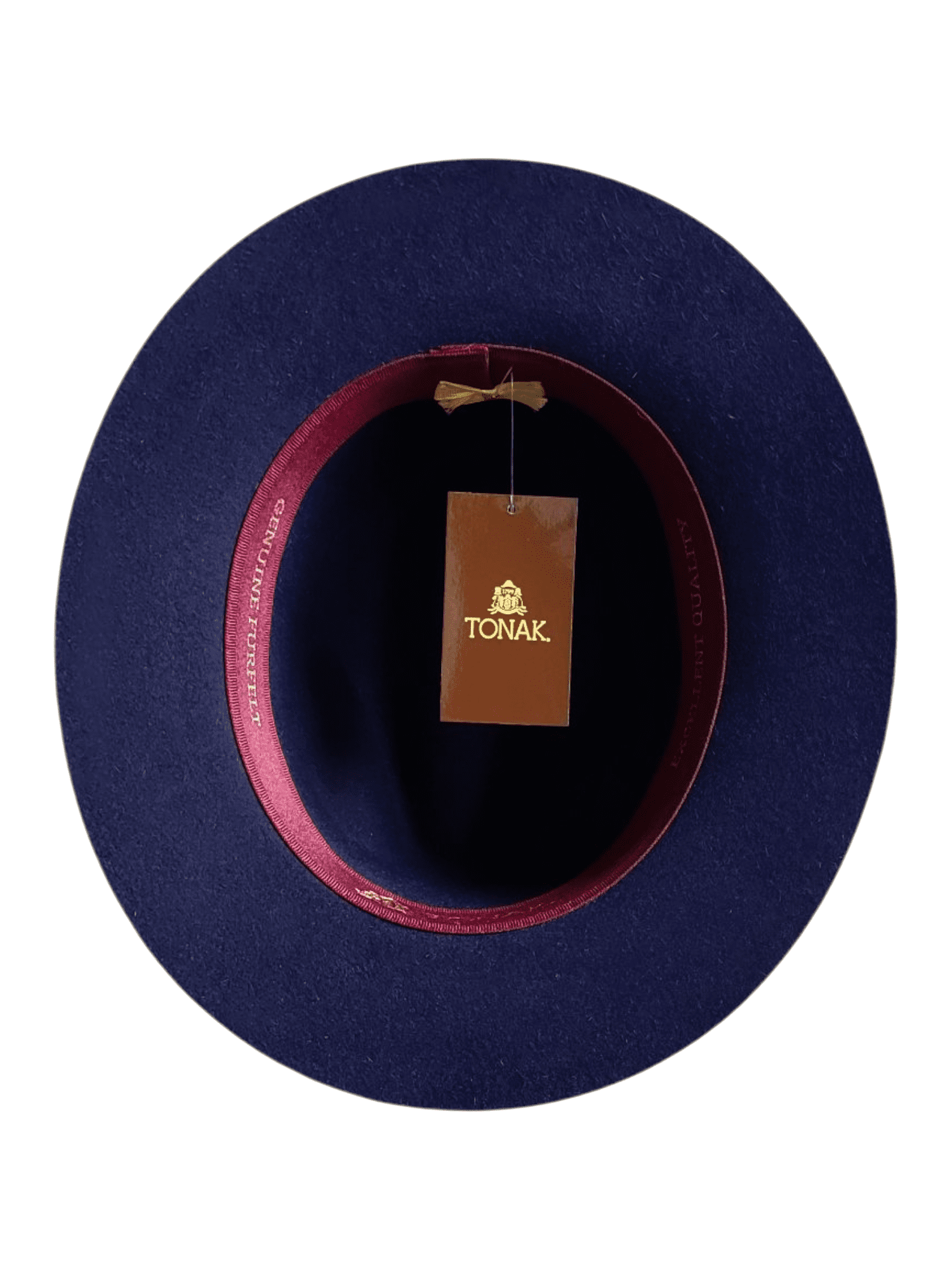 Wykończenie: Granatowa wstążka z biało-czerwonym obszyciem oraz przypinką marki Tonak w kształcie litery T