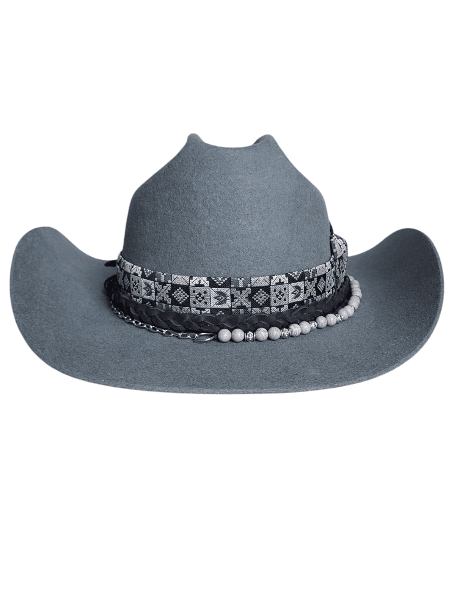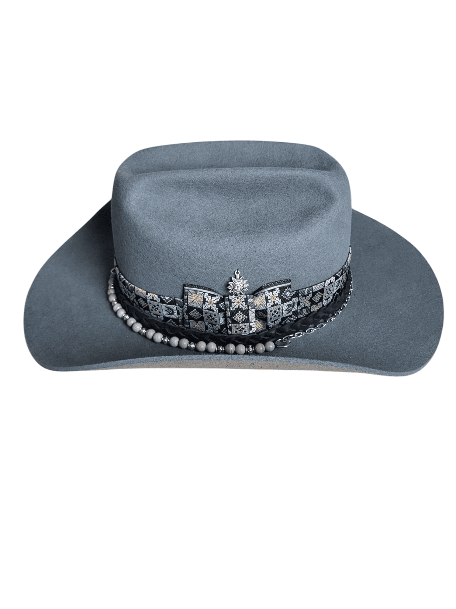 Ozdobiony plecionym skórzanym paskiem, łańcuszkiem z koralikami, wzorzystą kapeluszową wstążką z kokardą oraz metalową zawieszką w kształcie słońca